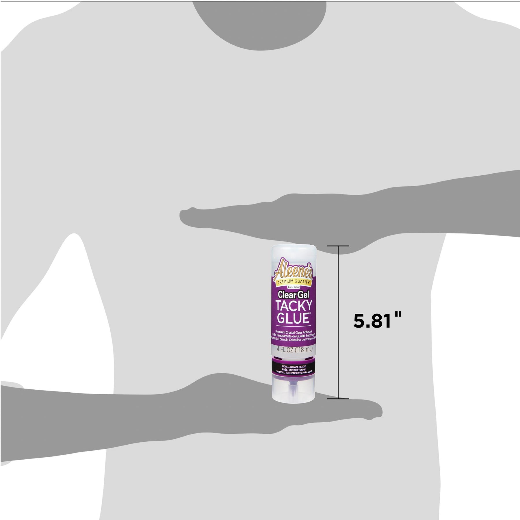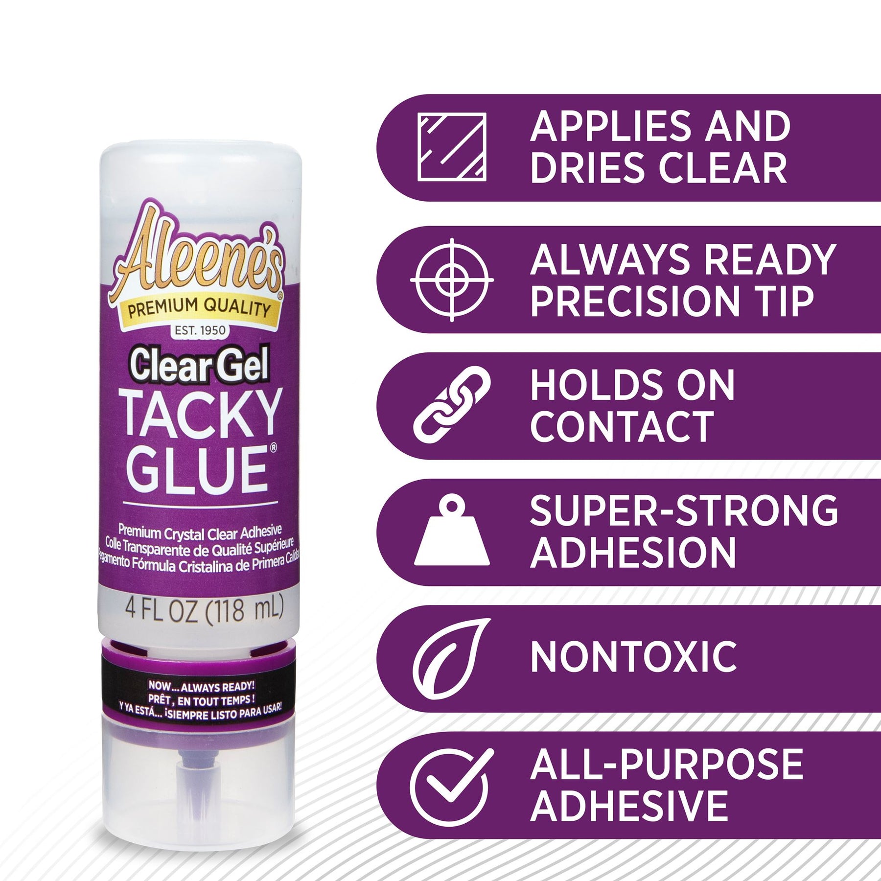 Aleene’s Always Ready Clear Gel Tacky Glue features a convenient, inverted cap stand with a no-cut tip for reliable application that works on just about every surface. Its transparent nontoxic formula applies and dries crystal-clear for permanent see-through placement that won’t yellow over time. Dries super strong and permanent, making it great for crafts, hobbies, DIYs and household repairs. Features 1 (4 fl. oz.) bottle of Aleene’s Always Ready Clear Gel Tacky Glue.