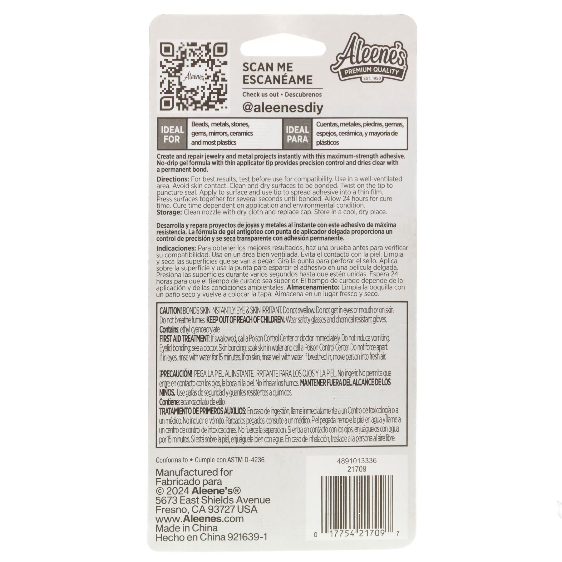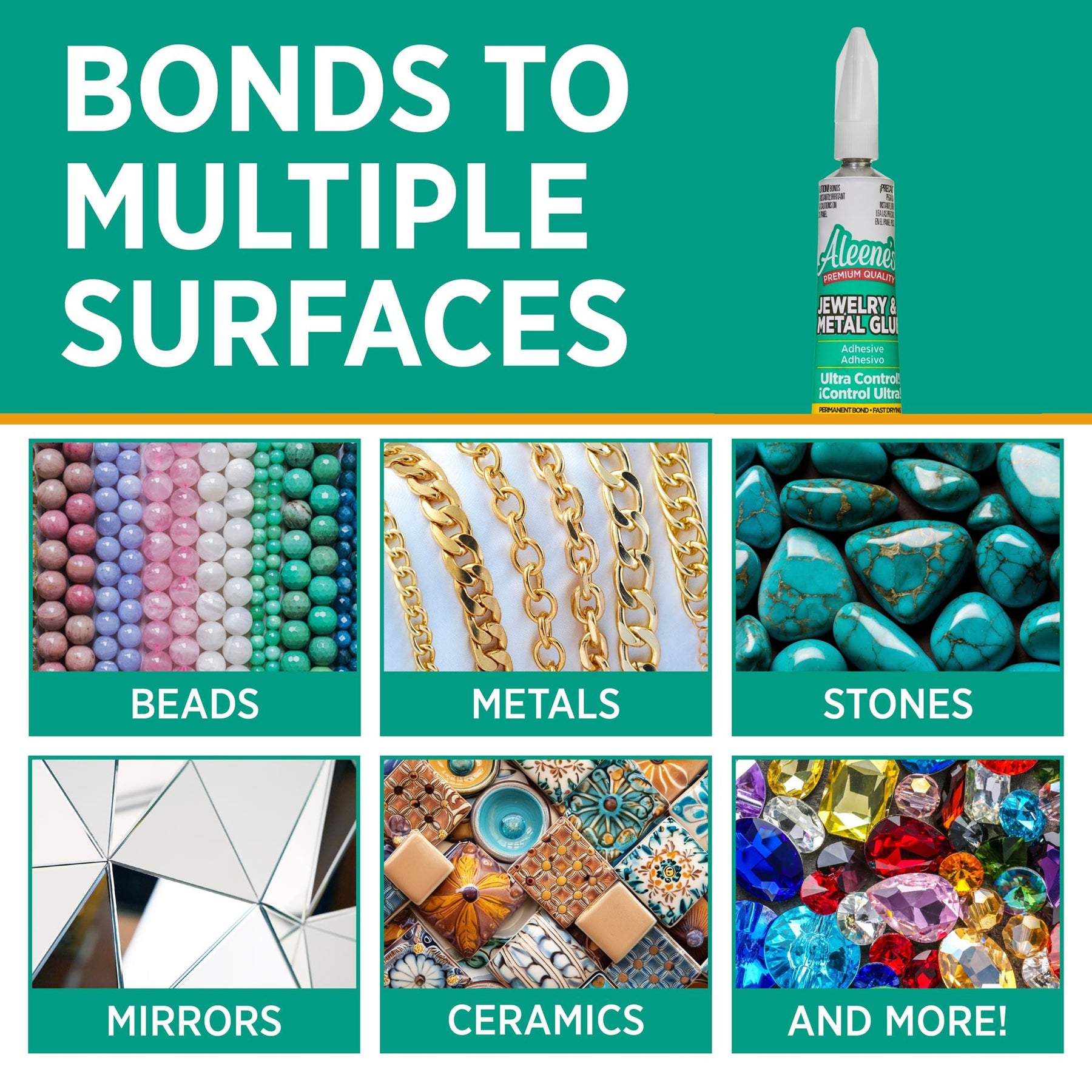 Aleene’s Jewelry & Metal Glue is your go-to glue when you need an easy solution for creating or repairing jewelry easily, quickly and permanently. Its no-drip, no-run formula provides precision control and dries crystal clear with a super strong and permanent bond. This hard-working glue is waterproof, and impact-resistant too! Instantly bond beads, metals, stones, glass, and more. Features 1 (.7 fl. oz.) tube of Aleene’s Jewelry & Metal Glue.