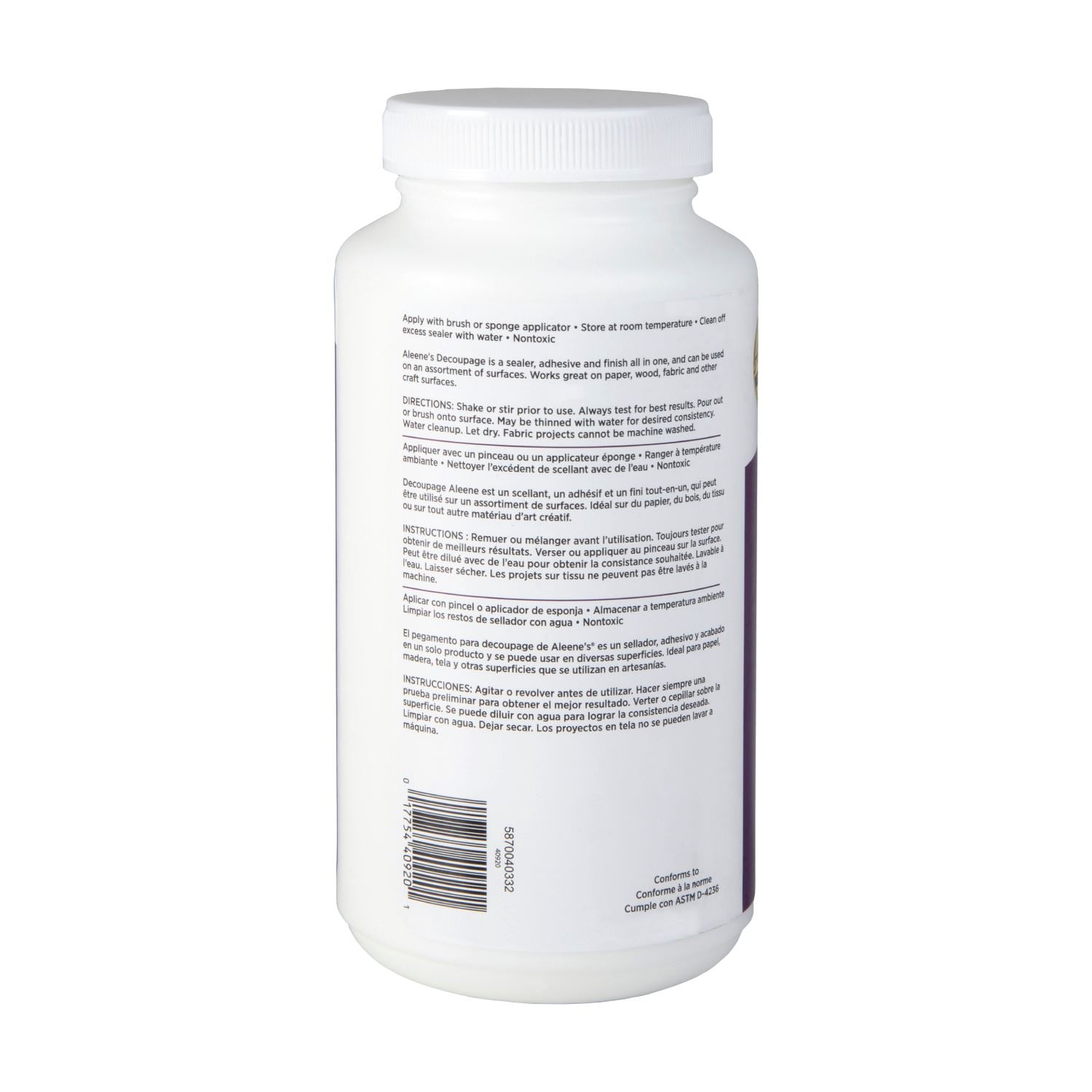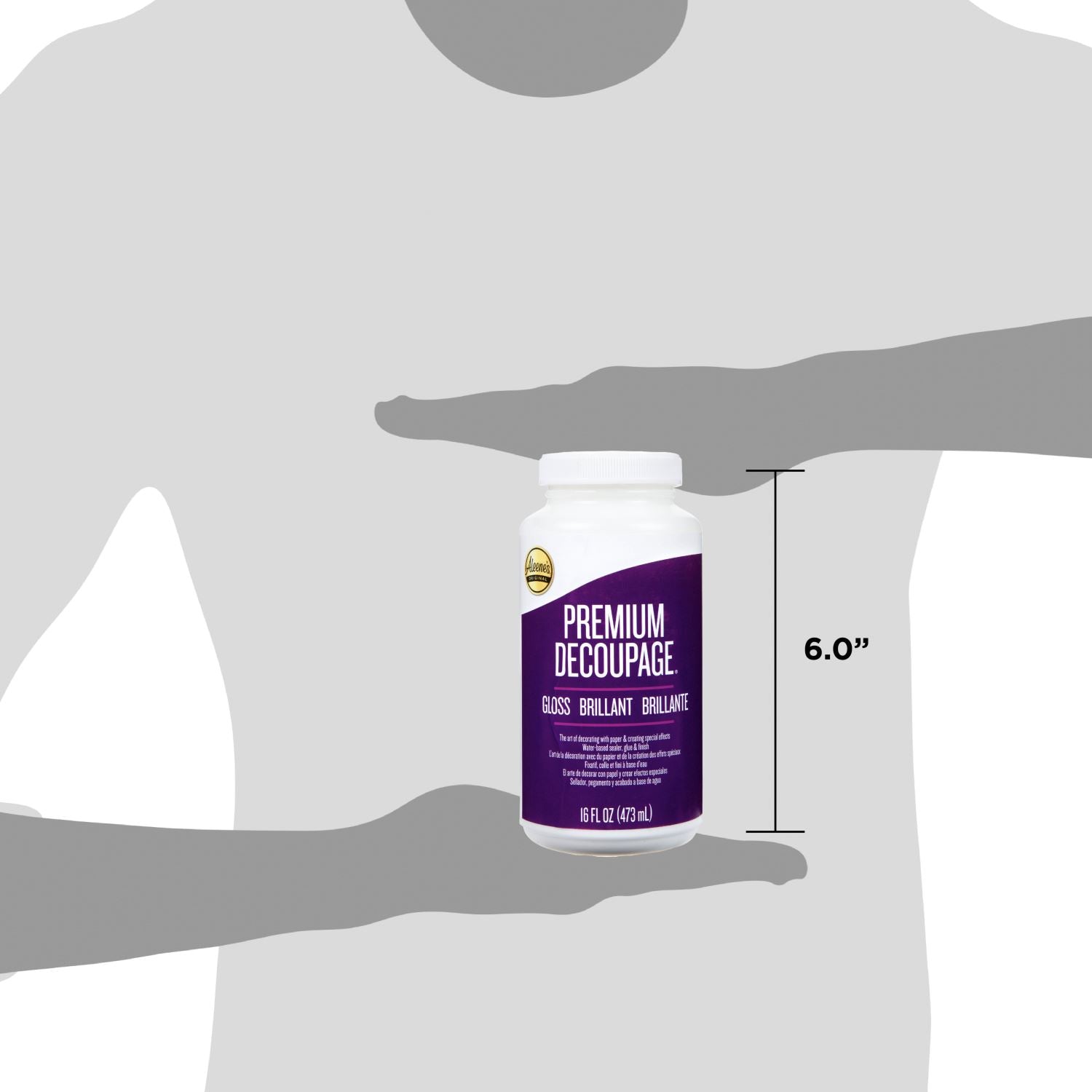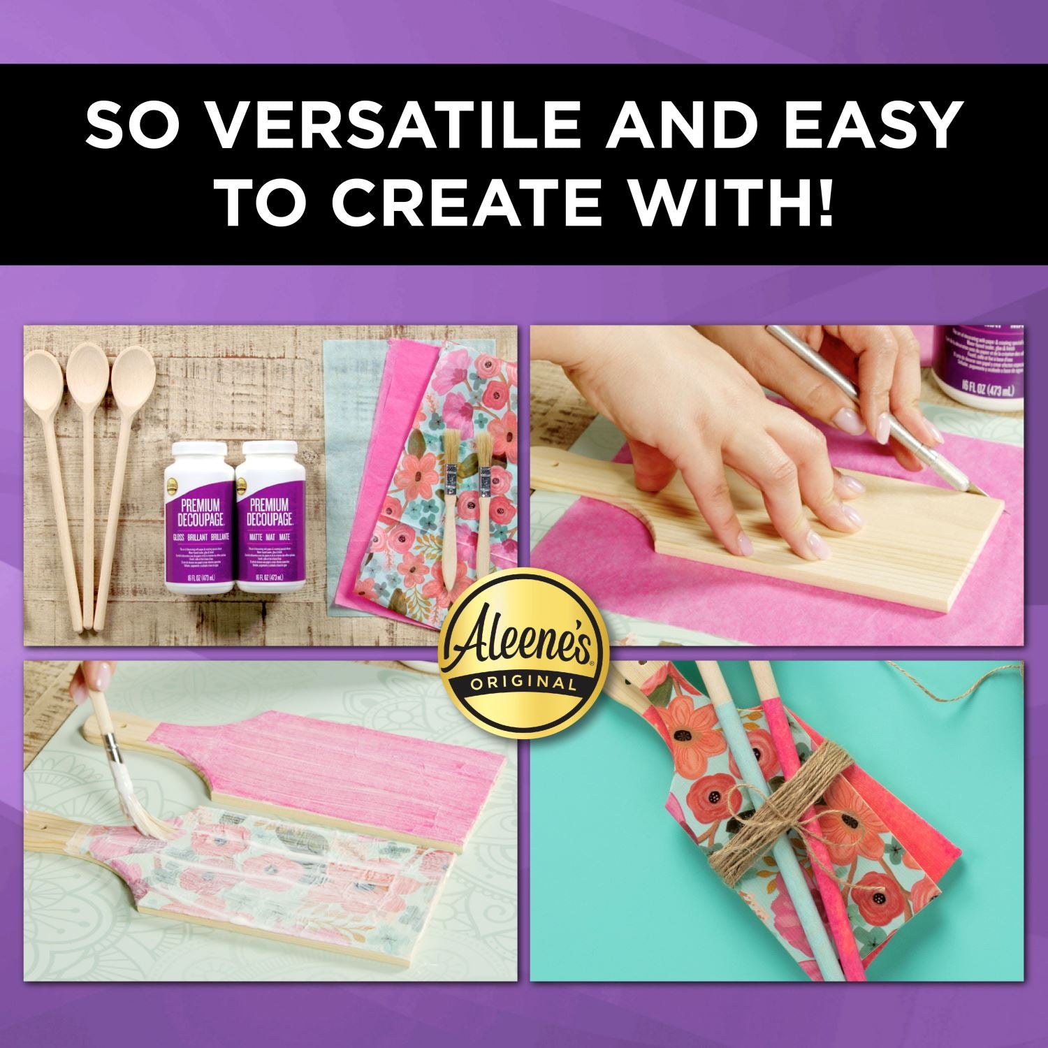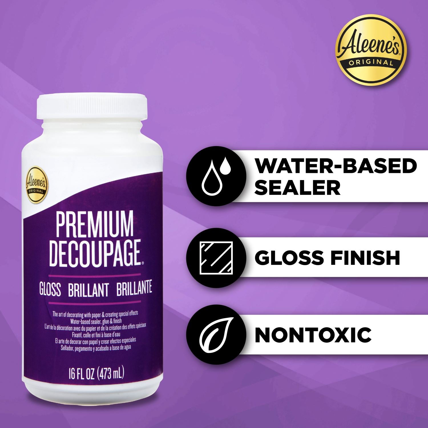 Aleenes Premium Decoupage is a water-based sealer, adhesive and finish all in one! This nontoxic decoupage can be used on an assortment of surfaces, such as paper, wood, fabric and more. Easy cleanup with water before drying, and dries with a glossy finish. Features 1 (16 fl. oz) tub of Aleene’s Premium Decoupage Gloss.