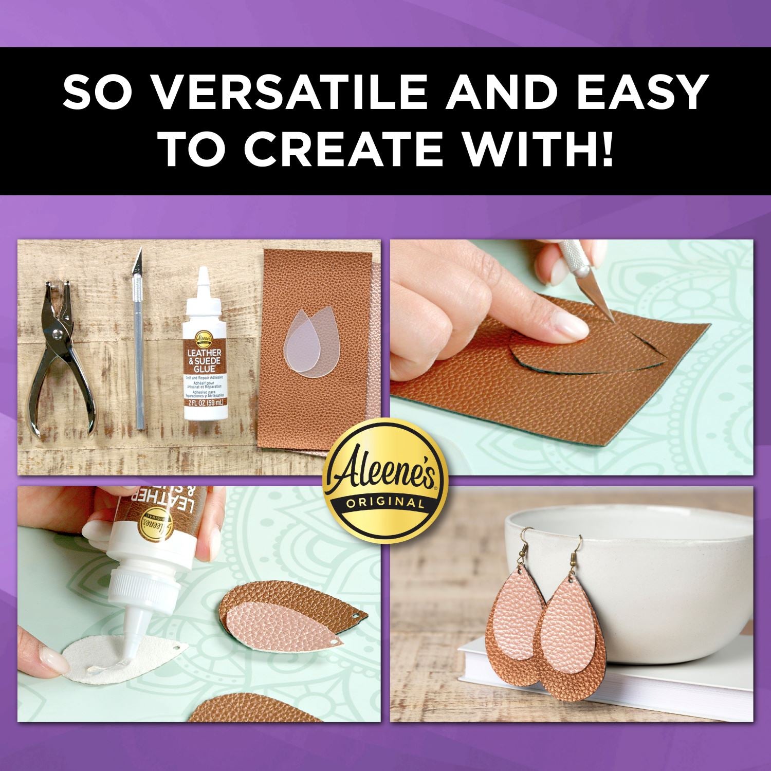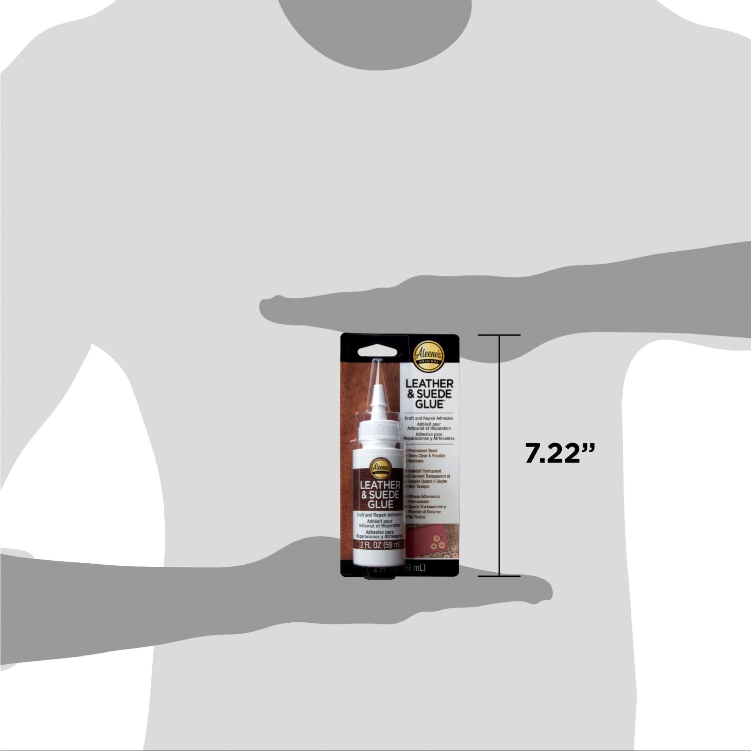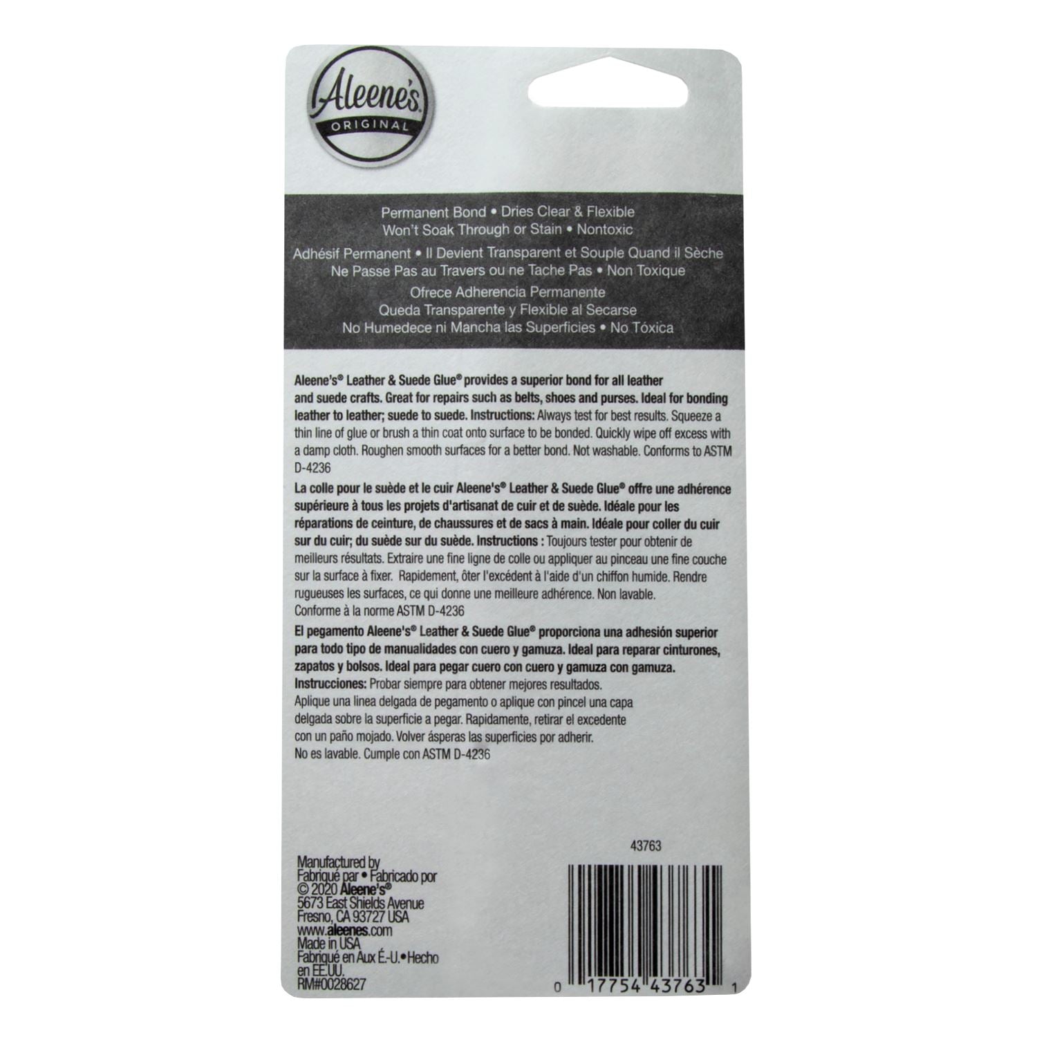 Aleene’s Leather & Suede Glue is your go-to glue for leather and suede repairs and projects! This fast-tacking glue dries clear and flexible, and won’t soak through or stain leathers and suedes. Use it for leather repair work and permanently bonding fringes, beadwork and other fabrics. Features 1 (2 fl. oz.) bottle of Aleene’s Leather & Suede Glue.